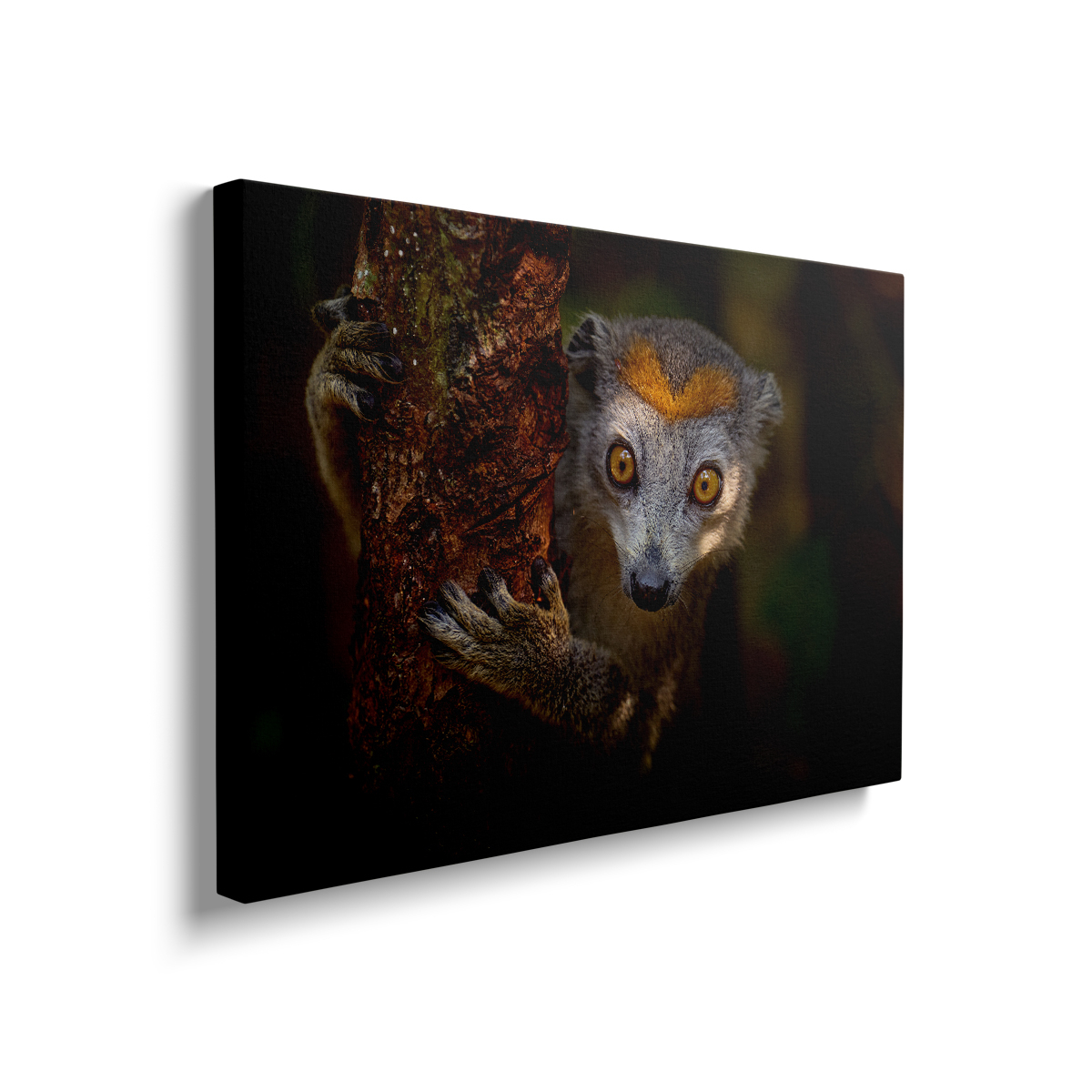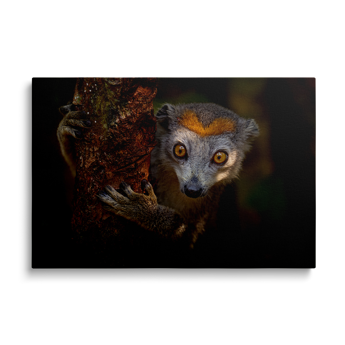 Acest tablou canvas prezintă un lemur cocoțat cu grație pe o ramură de copac, cu ochii săi mari și expresivi larg deschiși, emanând un sentiment de curiozitate și vigilență. Blana distinctivă a lemurului, caracterizată printr-un amestec de gri moi și alb, contrastează frumos cu verzile vibrante ale frunzișului din jur, creând un atractiv vizual izbitor. Detaliile complicate ale blănii sale și textura delicată a scoarței copacului sunt redate cu o claritate remarcabilă, invitând spectatorii să aprecieze frumusețea acestei primate unice în habitatul său natural. Compoziția nu numai că evidențiază comportamentul jucăuș al lemurului, dar subliniază și importanța conservării unei astfel de animale sălbatice fermecătoare și a ecosistemelor lor. Această imagine servește ca o amintire a minunilor naturii și a necesității eforturilor de conservare pentru a proteja aceste creaturi remarcabile și mediile lor.