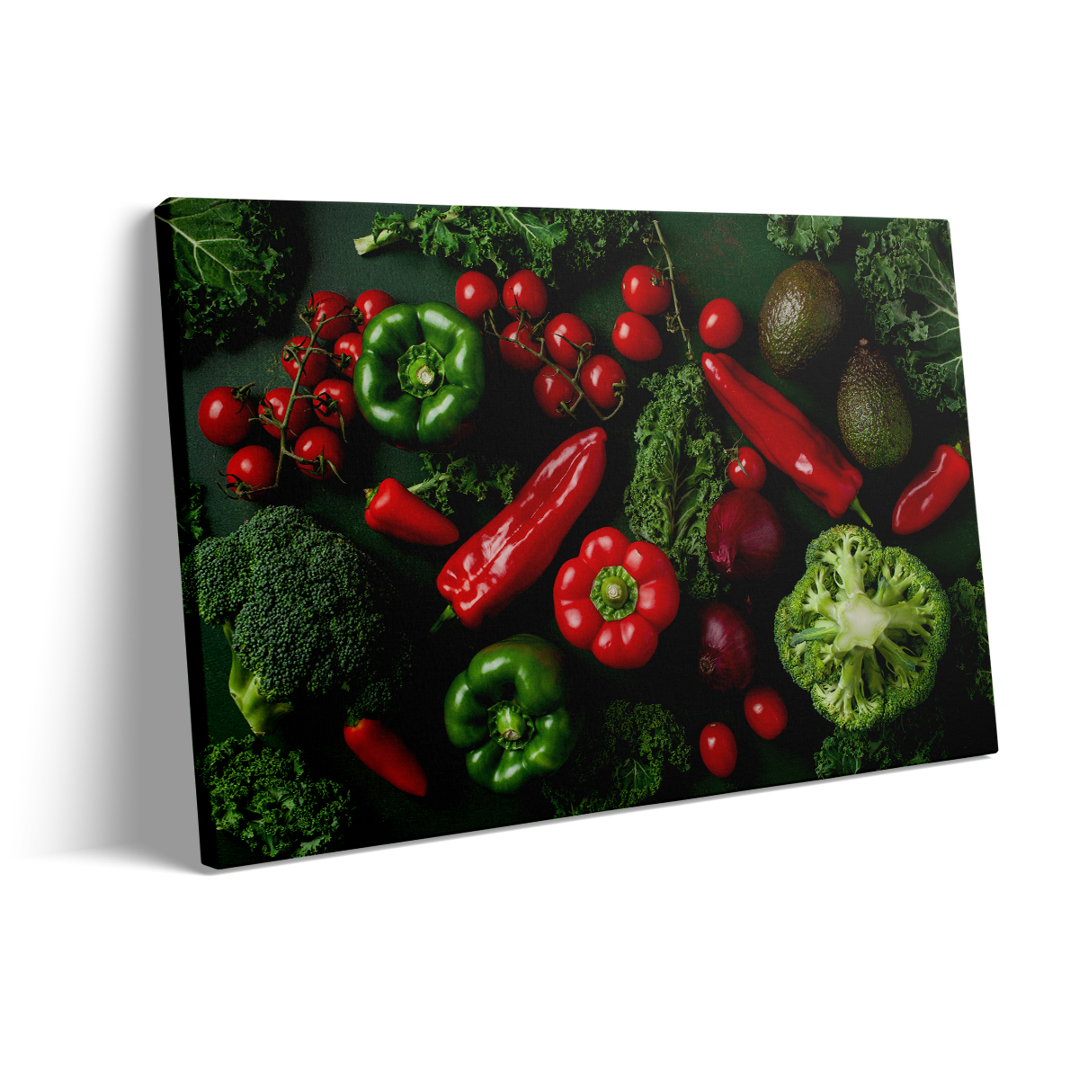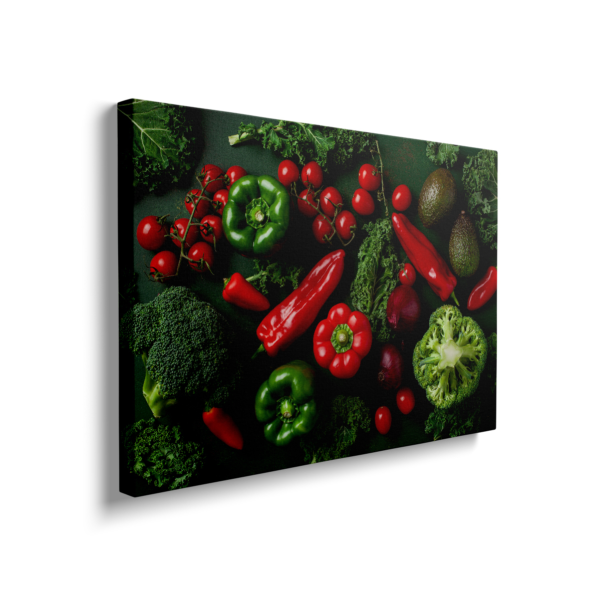 Acest tablou canvas cu fundal verde, prezintă o aranjare delicată de legume roșii și verzi, creând un contrast vizual remarcabil, atât revigorant cât și energizant. Pictura captează esența belșugului naturii, incluzând o gamă variată de legume, precum roșii coapte, ardei crocanți și legume verzi cu frunze luxuriate, toate realizate în culori bogate și vii care dau viață compoziției. Utilizarea unui fundal verde nu doar că accentuează prospețimea legumelor, dar evocă și un sentiment de vitalitate organică, făcându-l o adăugire ideală pentru bucătării, zone de luat masa sau orice spațiu care celebrează un trai sănătos și creativitatea culinară. Această lucrare nu servește doar ca element decorativ, ci și ca un memento al importanței produselor proaspete în dieta noastră, atrăgând atât iubitorii de artă, cât și persoanele conștiente de sănătate.