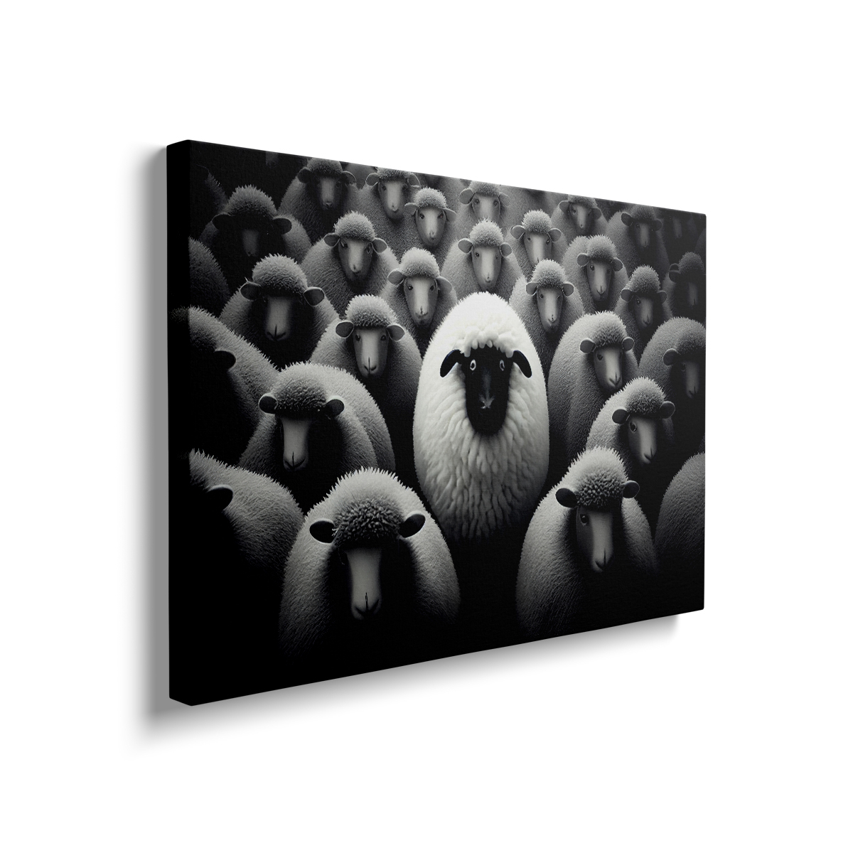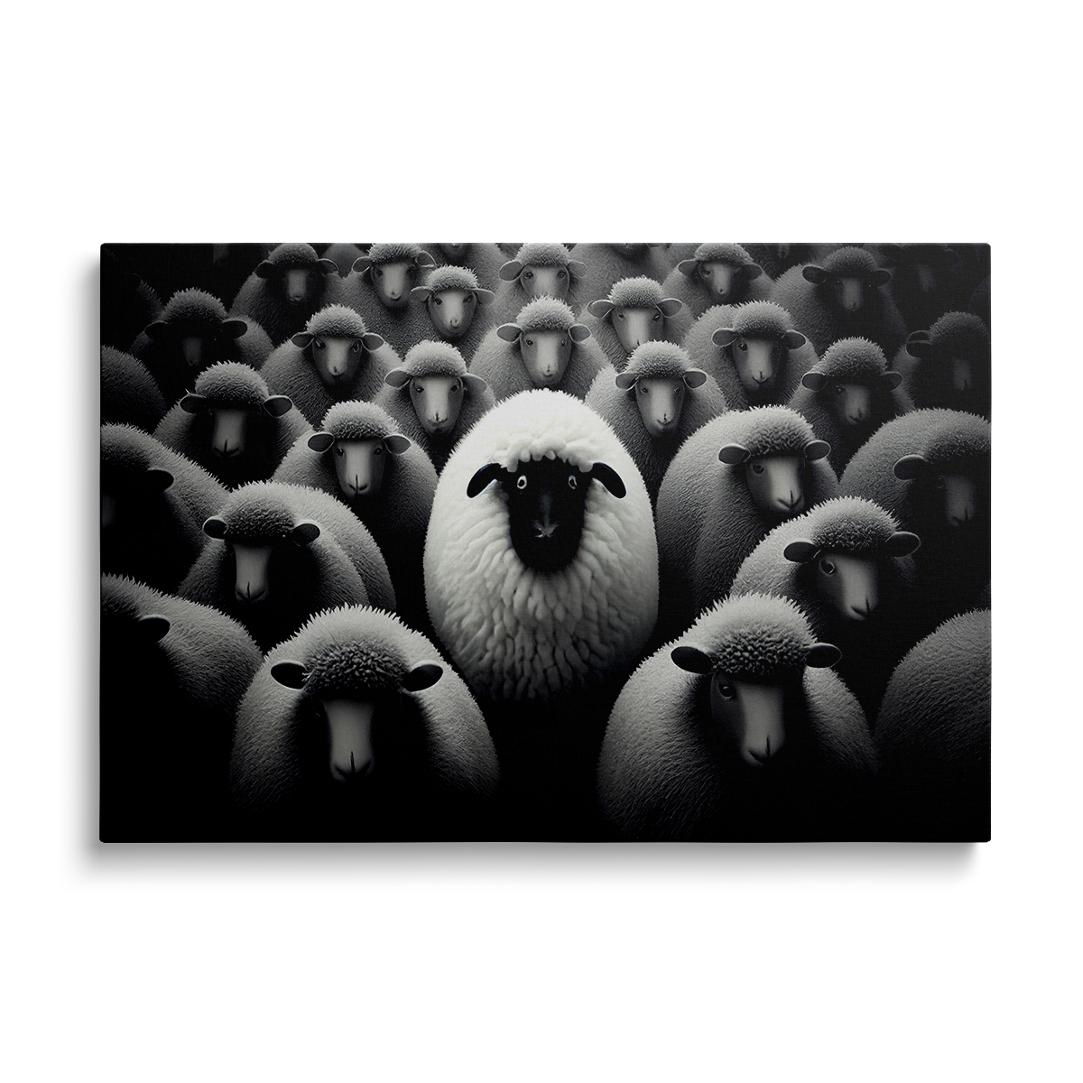 Acesta tablou canvas alb-negru surprinde o scenă senină, dar dinamică, a oilor adunate strâns, creând un sentiment de unitate și comunitate în rândul turmei. Paleta monocromatică îmbunătățește texturile lânii, evidențiind modelele complicate și variațiile din haina fiecărei oaie, în timp ce absența culorii atrage atenția privitorului asupra formelor și formelor din mulțime. Compoziția invită la contemplare, întrucât privitorul poate observa interacțiunile și comportamentele subtile ale animalelor, evocând un sentiment de liniște și conexiune cu natura. Această imagine servește ca o reamintire puternică a frumuseții găsite în simplitate și a importanței unirii în regnul animal, făcând-o un plus ideal pentru orice colecție axată pe animale sălbatice sau teme pastorale.