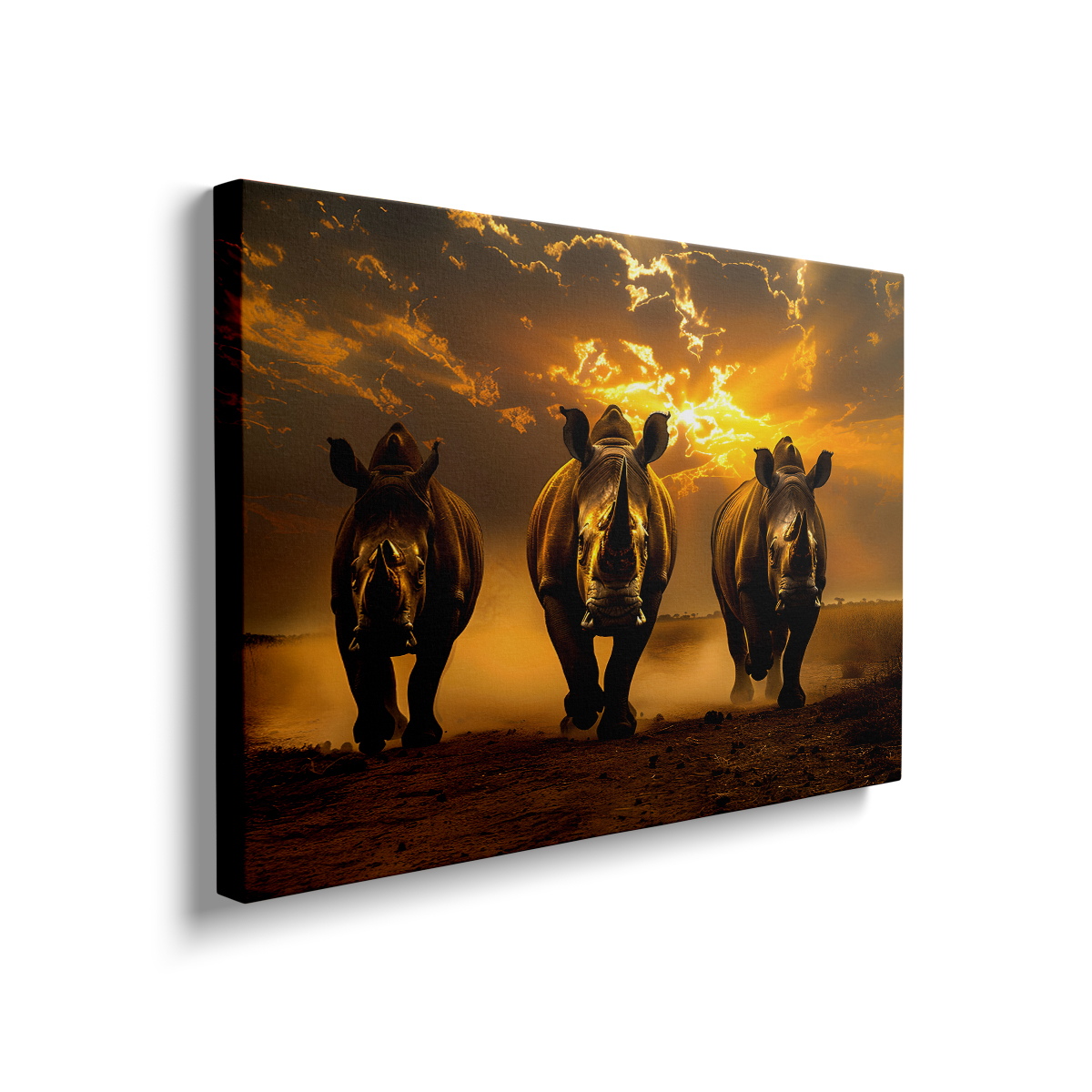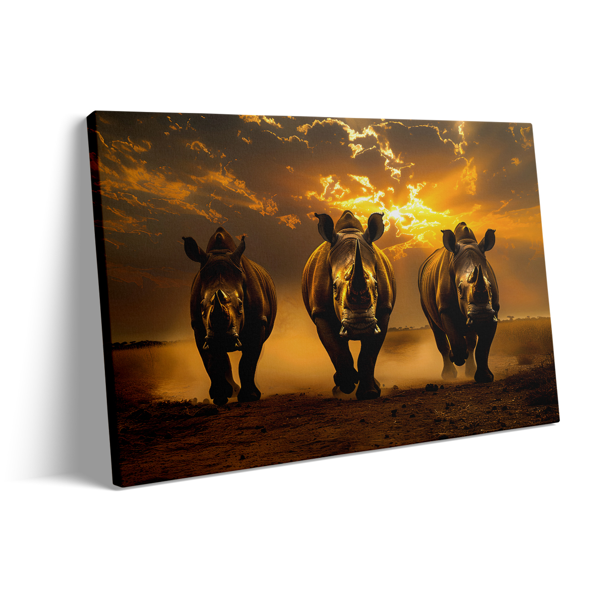 Acest tablou canvas surprinde frumusețea maiestuoasă a trei rinoceri care traversează cu grație habitatul lor natural în timp ce soarele apune la orizont. Nuanțele calde ale apusului, cu nuanțe de portocaliu, roz și violet, creează un fundal uluitor care îmbunătățește siluetele puternice ale rinocerilor, simbolizând puterea și rezistența. Detaliile complicate ale pielii texturate a animalelor și jocul blând de lumină de-a lungul formelor lor invită spectatorii să aprecieze frumusețea brută a vieții sălbatice. Perfectă atât pentru pasionații de natură, cât și pentru colecționarii de artă, această piesă nu numai că servește ca un punct focal izbitor în orice cameră, dar evocă și un sentiment de liniște și conexiune cu lumea naturală. Ideală pentru camere de zi, birouri sau galerii, această pânză este o sărbătoare a sălbăticiei, făcând-o un plus atemporal pentru orice colecție de artă.