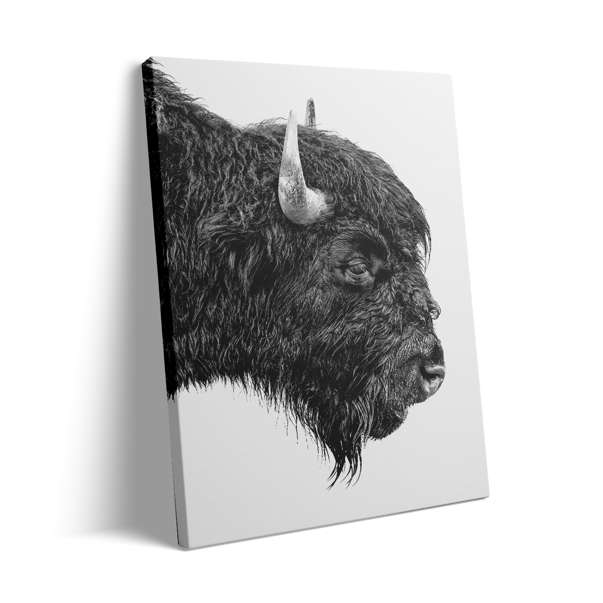 Acest tablou canvas prezintă un cap de bizon în nuanțe de alb și negru, evidențiat pe un fundal alb pur, creând un contrast puternic și atrăgător. Detaliile fine ale blănii bizonului, precum și expresia sa impunătoare, sunt surprinse cu o precizie artistică, oferind o senzație de putere și noblețe. Designul minimalist al fundalului alb permite ca figura bizonului să iasă în evidență, transformând această lucrare într-o piesă de artă ideală pentru decorarea oricărui spațiu, fie că este vorba despre un birou modern, un living elegant sau o galerie de artă. Această reprezentare simbolică a bizonului, un animal venerat în multe culturi pentru forța și rezistența sa, aduce un plus de caracter și stil oricărei încăperi, fiind o alegere perfectă pentru iubitorii de natură și artă contemporană.