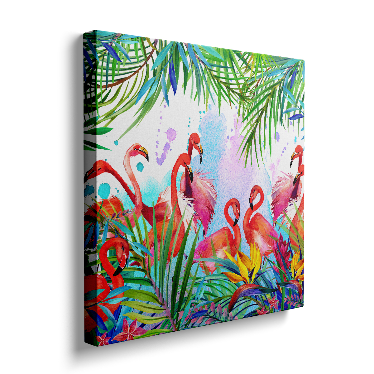 Acest captivanat tablou canvas, ilustrează o scenă vibrantă cu flamingo în mijlocul unei junglei luxuriante, unde nuanțele de roz ale păsărilor se îmbină armonios cu verdele intens al vegetației. Detaliile minuțioase ale penajului flamingo-ului, evidențiate printr-o paletă de culori calde, creează un contrast fascinant cu fundalul bogat de frunze și flori exotice. Atmosfera generală a lucrării evocă o senzație de liniște și frumusețe naturală, invitând privitorul să se piardă în acest peisaj idilic. Această pictură nu este doar o simplă reprezentare artistică, ci și o celebrare a biodiversității și a frumuseții naturii, fiind un element decorativ ideal pentru orice spațiu care dorește să aducă un strop de exotism și eleganță.