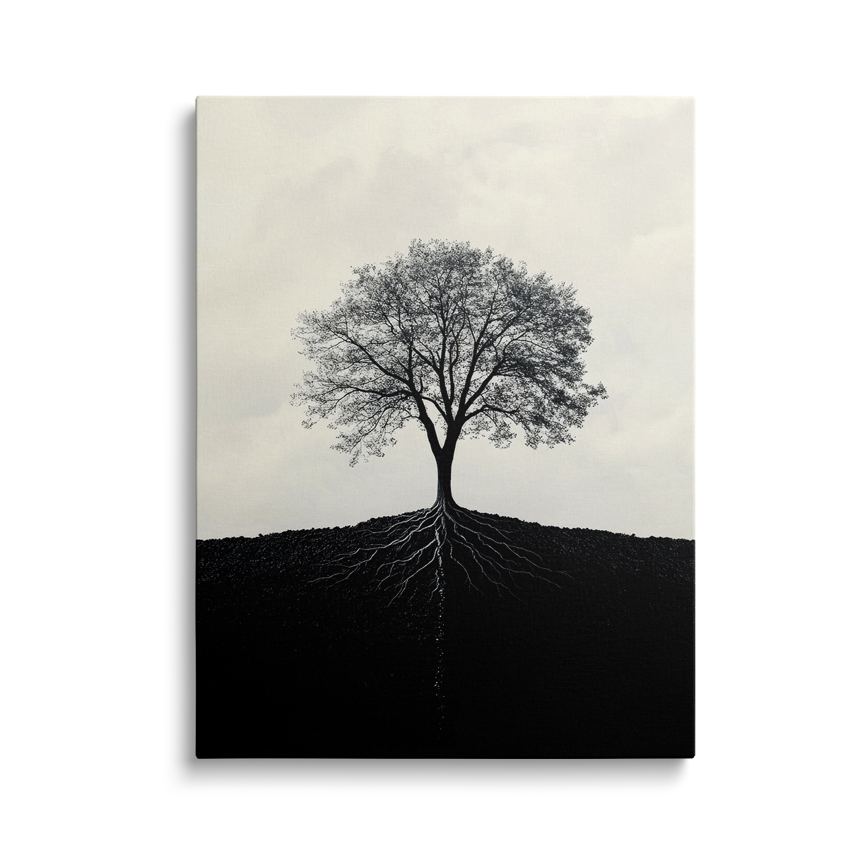 Acest tablou canavas prezintă un copac alb-negru, cu o siluetă elegantă, situat pe o colină, care emană o atmosferă de mister și serenitate. Rădăcinile copacului, bine conturate, se întind adânc în pământ, simbolizând stabilitate și conexiune cu natura. Contrastul dintre nuanțele de alb și negru accentuează detaliile texturii scoarței și ale frunzelor, creând un efect vizual puternic și evocator. Colina pe care se află copacul adaugă o dimensiune suplimentară, sugerând o ascensiune spirituală sau o călătorie interioară. Această compoziție artistică este ideală pentru cei care apreciază arta minimalistă și simbolismul profund al naturii, fiind o alegere perfectă pentru decorarea unui spațiu modern sau pentru a adăuga un accent de eleganță în orice mediu.
