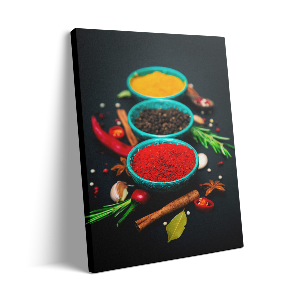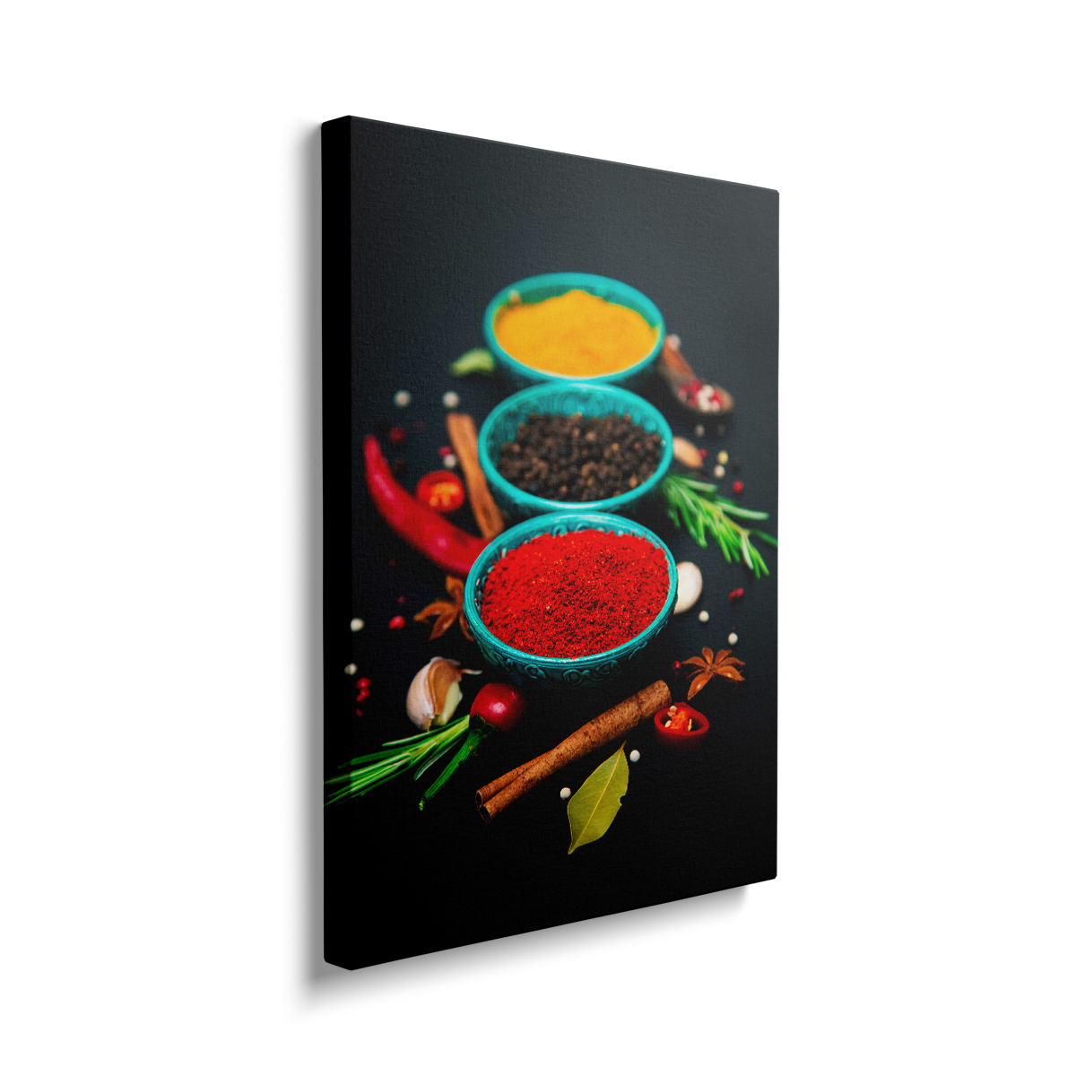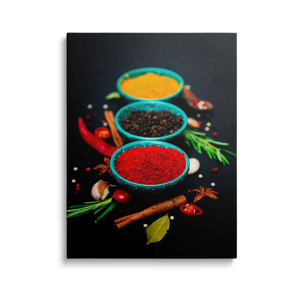 Acest tablou canvas prezintă o selecție variată de condimente și mirodenii, aranjate artistic pe un fundal negru, care evidențiază culorile vibrante și texturile unice ale fiecărui ingredient. Fiecare condiment, de la boia de ardei roșu strălucitor la semințele de chimen delicate, este prezentat cu o claritate remarcabilă, invitând privitorul să exploreze nu doar aspectul vizual, ci și aromele bogate pe care acestea le aduc în preparatele culinare. Fundalul întunecat servește ca un cadru perfect, accentuând nuanțele calde și naturale ale mirodeniilor, transformând această compunere într-o operă de artă gastronomică. Această imagine nu este doar o simplă reprezentare a condimentelor, ci o celebrare a diversității și bogăției pe care acestea le oferă în arta gătitului, inspirând pasionații de gastronomie să experimenteze și să îmbogățească fiecare masă cu arome inconfundabile.