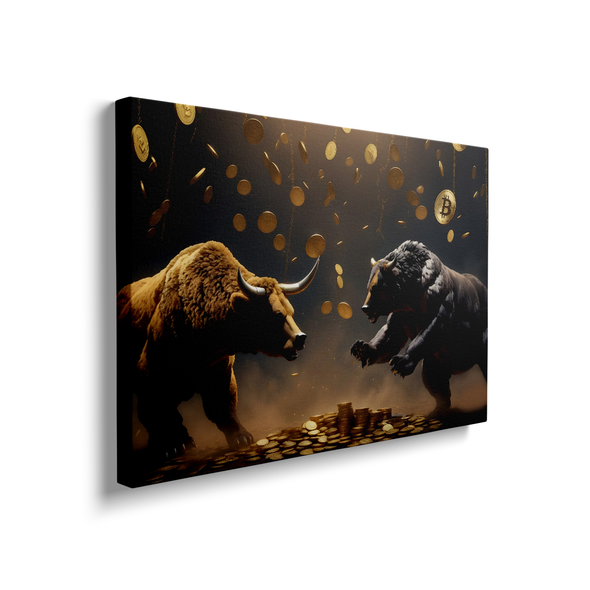 Acest tablou canvas surprinde o scenă dramatică în care un taur și un urs care se confruntă, simbolizând lupta pentru bogăție și putere. Fundalul negru accentuează intensitatea momentului, punând în evidență strălucirea monedelor de aur împrăștiate în jurul lor. Acești tauri, cu mușchii bine definiți și coarnele amenințătoare, par să fie angajați într-o bătălie feroce, fiecare încercând să-și revendice comoara strălucitoare. Monedele de aur, cu detalii fine și reflexii luminoase, adaugă un contrast captivant cu întunericul din jur, sugerând nu doar valoarea materială, ci și dorința nestăvilită de a obține succesul. Această imagine evocatoare poate fi interpretată ca o metaforă a competiției în lumea afacerilor sau a ambițiilor personale, făcând-o un element vizual puternic și provocator.
