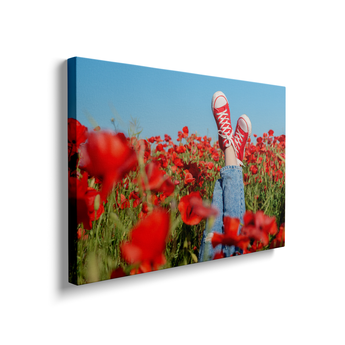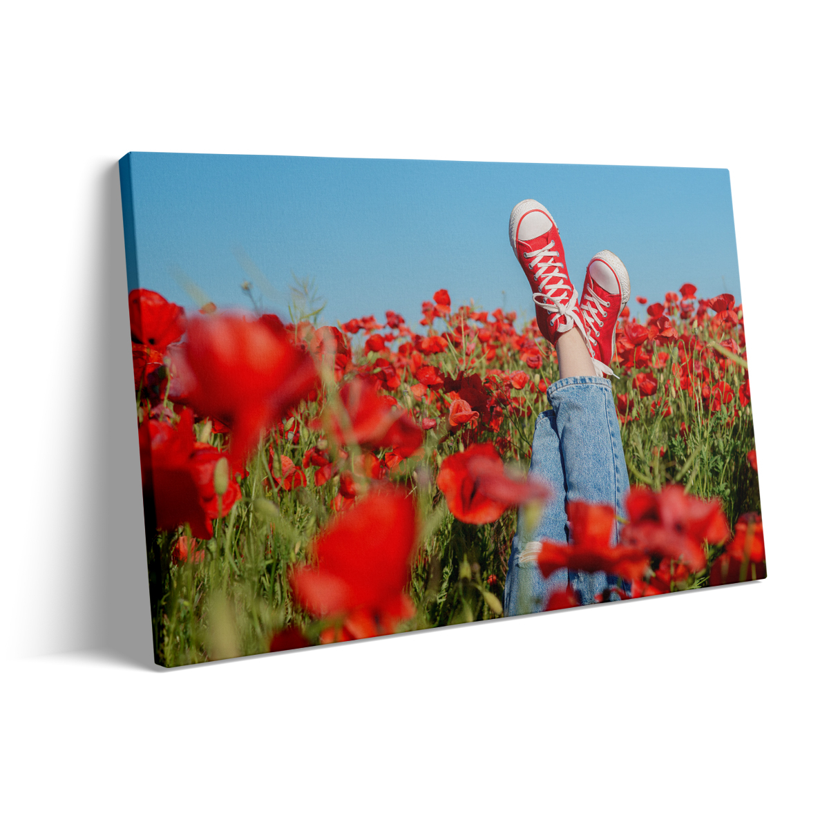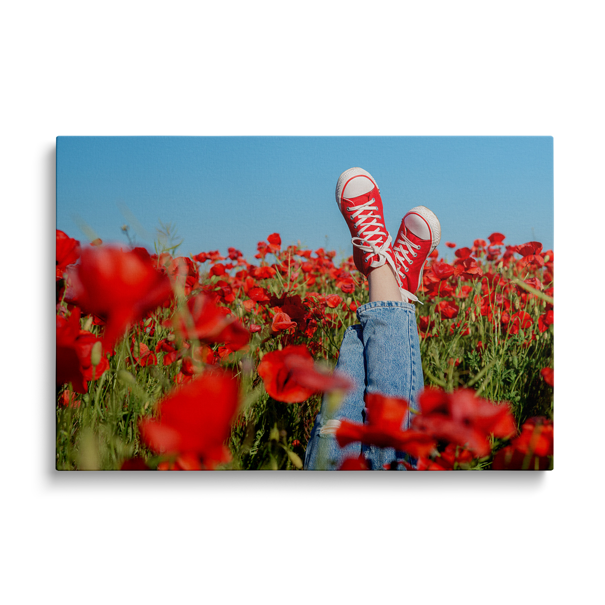 Acest tablou canvas surprinde picioarele unei persoane așezate într-un câmp de maci roșii, creând o atmosferă de liniște și frumusețe naturală. Culoarea vibrantă a macilor contrastează splendid cu nuanțele pielii, evidențiind o conexiune profundă cu natura. Câmpul de flori, cu petalele sale delicate și strălucitoare, pare să se întindă la nesfârșit, invitând privitorul să se piardă în peisajul idilic. Această scenă evocă o senzație de libertate și relaxare, sugerând o evadare din agitația cotidiană. Este o reprezentare perfectă a momentelor de contemplare și apreciere a frumuseții simple, dar impresionante, pe care natura o oferă.