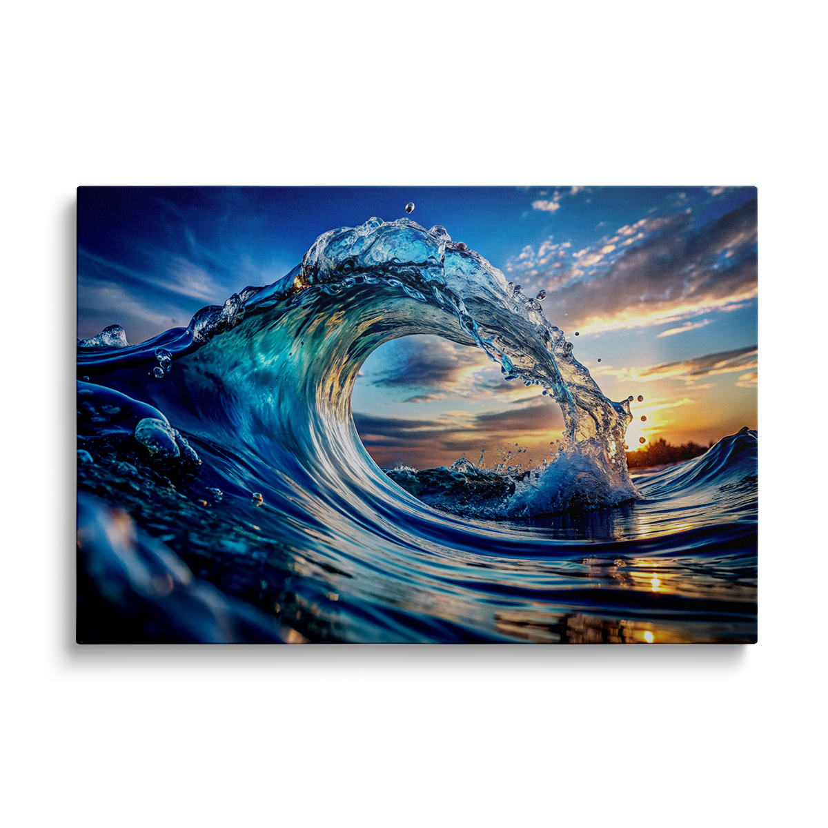 Acest tablou canvas surprinde un val oceanic imens care se prăbușește cu forță în apă, în timp ce soarele apune la orizont, creând un spectacol de culori calde și vibrante. Reflexiile aurii și portocalii ale razelor solare se împletesc cu nuanțele adânci ale albastrului oceanului, oferind o atmosferă de liniște și putere în același timp. Valul, cu spuma sa albă și efervescentă, pare să capteze esența mișcării și a energiei naturale, evocând o senzație de uimire și respect față de forțele naturii. Această compoziție vizuală nu doar că încântă privitorul, dar și invită la reflecție asupra frumuseții și măreției oceanului, făcând din această imagine o alegere perfectă pentru decorarea oricărui spațiu dedicat relaxării și contemplării.