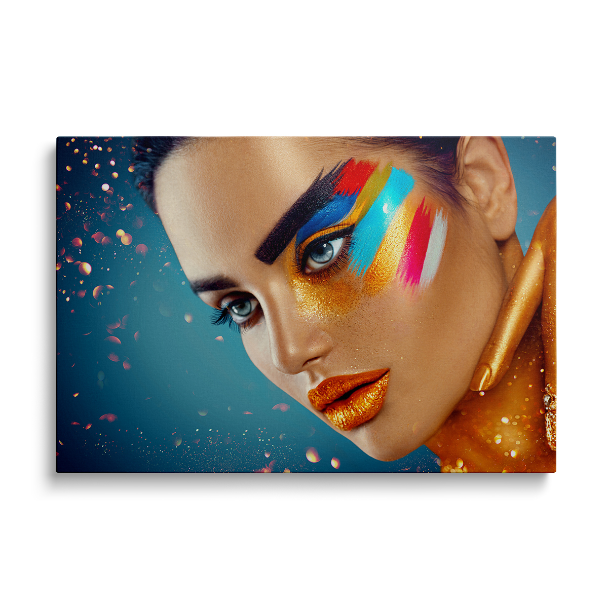 Acest tablou canvas prezintă o femeie cu un machiaj vibrant și un chip plin de culoare, care emană o energie creativă și o personalitate exuberantă. Fiecare nuanță de pe fața ei este aleasă cu grijă, de la tonuri strălucitoare de roz și violet, la accente îndrăznețe de galben și verde, care se îmbină armonios pentru a crea un efect vizual impresionant. Machiajul nu doar că subliniază trăsăturile feței, dar și reflectă o atitudine jucăușă și artistică, invitând privitorul să exploreze universul divers al expresiei de sine prin culoare. Această reprezentare nu este doar o simplă ilustrare a frumuseții, ci și o celebrare a individualității și a creativității, inspirându-i pe alții să își exprime personalitatea prin intermediul artei machiajului.