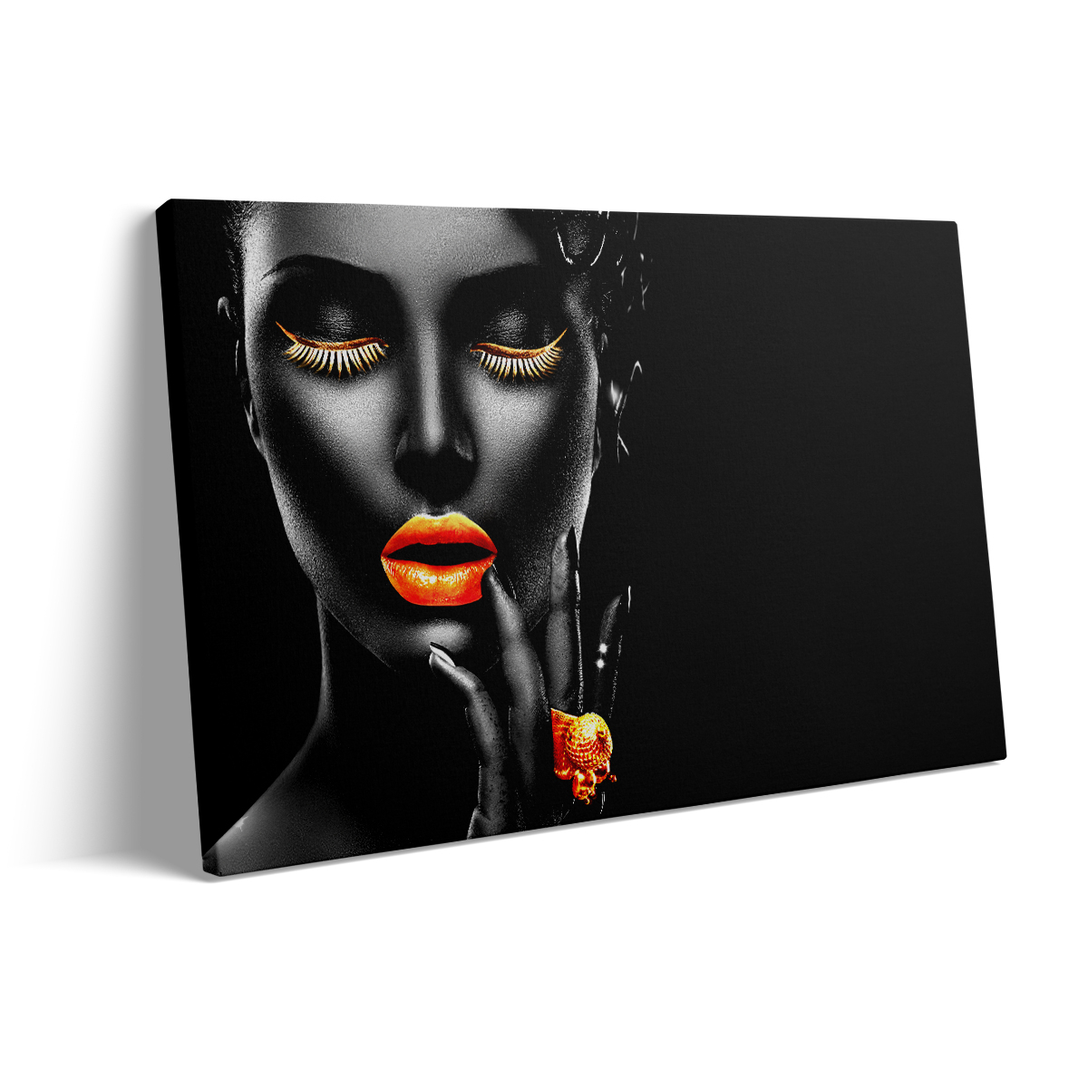 Acest tablou canvas captivant prezintă o femeie cu un ten de nuanță închisă, evidențiată de un machiaj îndrăzneț, care include buze de un portocaliu strălucitor. Contrastul dintre tonurile de negru și portocaliu creează o estetică vibrantă și atrăgătoare, subliniind nu doar frumusețea naturală a subiectului, ci și un stil personal distinctiv. Femeia emană încredere și carismă, iar nuanța intensă a buzelor sale adaugă o notă de dramatism și sofisticare. Această combinație de culori nu doar că atrage privirea, dar și sugerează o personalitate puternică și un simț al modei bine definit, făcând din această imagine o alegere ideală pentru campanii de promovare a produselor de frumusețe sau a stilului de viață modern.