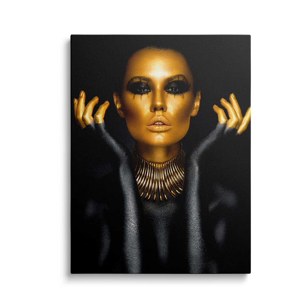 Acest tablou canvas prezintă o femeie elegantă, cu un design sofisticat, în nuanțe de negru și aur. Fața și mâinile sale sunt realizate dintr-un aur strălucitor, care reflectă lumina într-un mod fascinant, adăugând un aer de mister și rafinament. Îmbrăcată într-o rochie neagră, fluidă, care se conturează perfect pe silueta sa, figura feminină emană o putere și o grație aparte. Detaliile fine ale creației, cum ar fi texturile delicate și contrastul dintre negru și aur, subliniază nu doar frumusețea exterioară, ci și o profunzime simbolică, sugerând o legătură între forța feminină și eleganța divină. Această lucrare este ideală pentru a adăuga un accent artistic oricărui spațiu, fiind o alegere perfectă pentru iubitorii de artă care apreciază combinația dintre modernitate și tradiție.