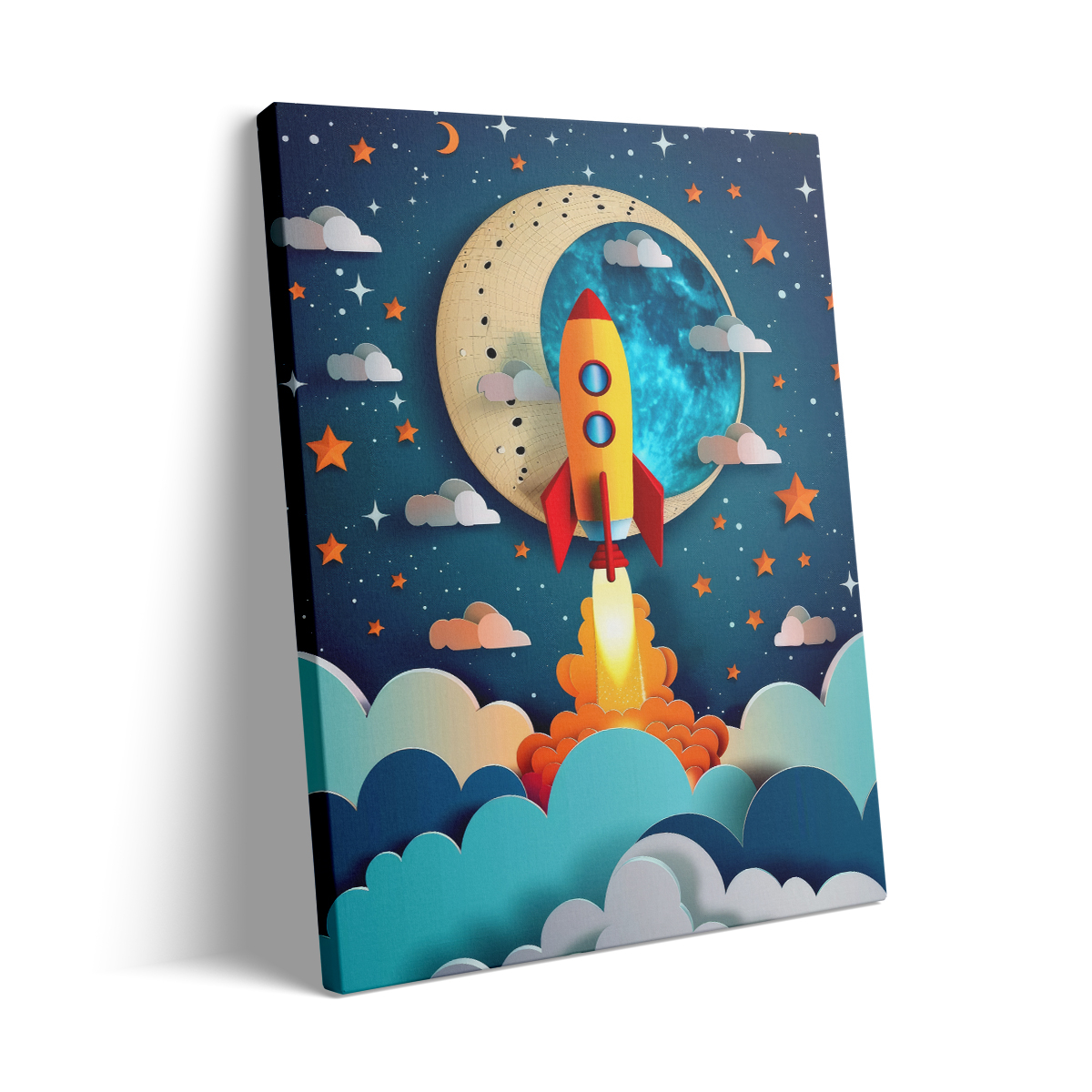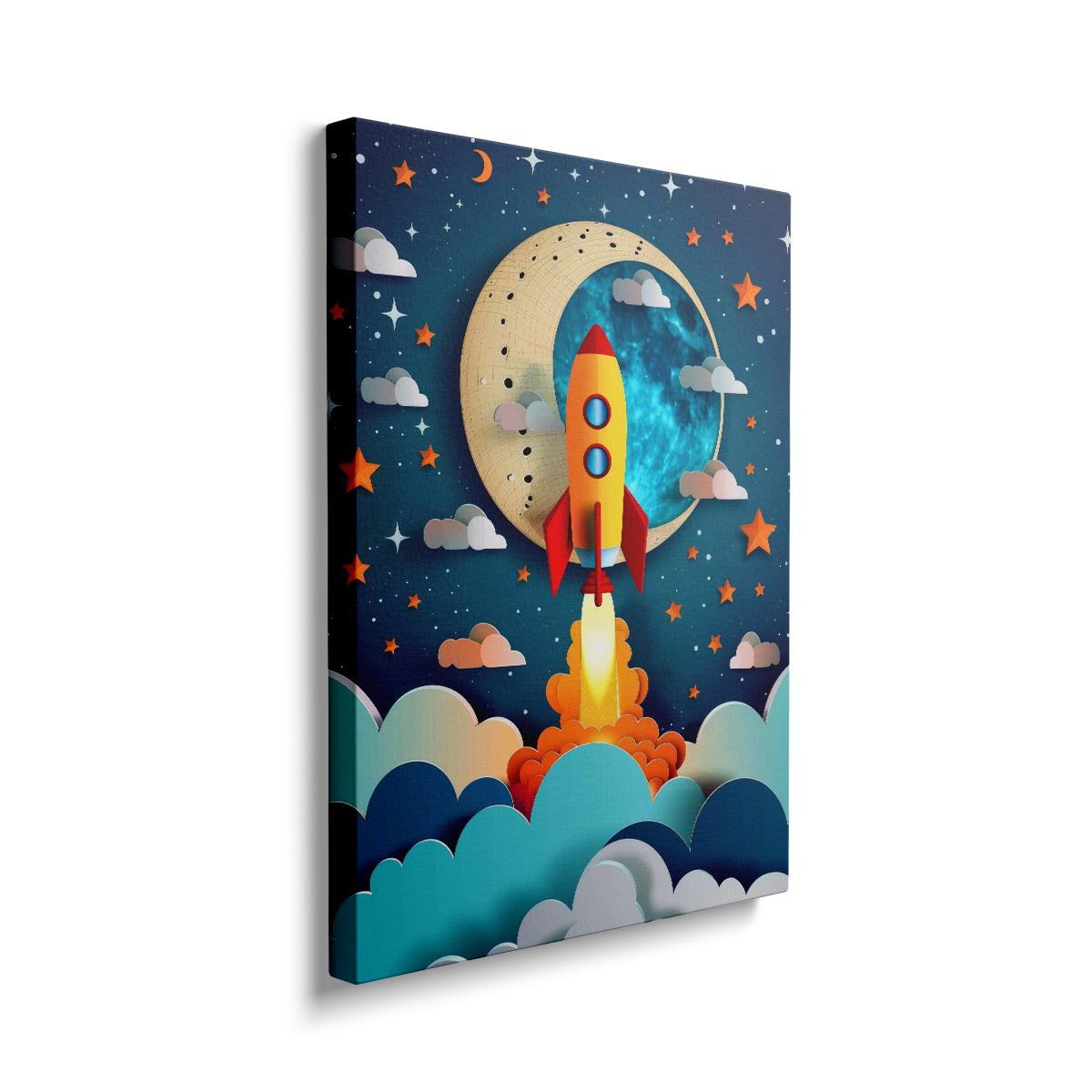 Acest tablou canvas ilustrează o rachetă zburând cu viteză printr-un cer plin de nori pufoși și stele strălucitoare, evocând un sentiment de aventură și explorare. Racheta, cu un design futurist și culori vibrante, se desprinde de pe sol, simbolizând aspirațiile umane de a depăși limitele și de a explora necunoscutul. Nori albi și moi se împletesc în jurul ei, adăugând o notă de visare și fantezie, în timp ce stelele, ce strălucesc pe fundalul întunecat al cerului, sugerează vastitatea universului și posibilitățile infinite care așteaptă să fie descoperite. Această compoziție nu doar că încântă privitorul, dar și inspiră imaginația, invitându-l să viseze la călătorii interstelare și la descoperiri uimitoare.