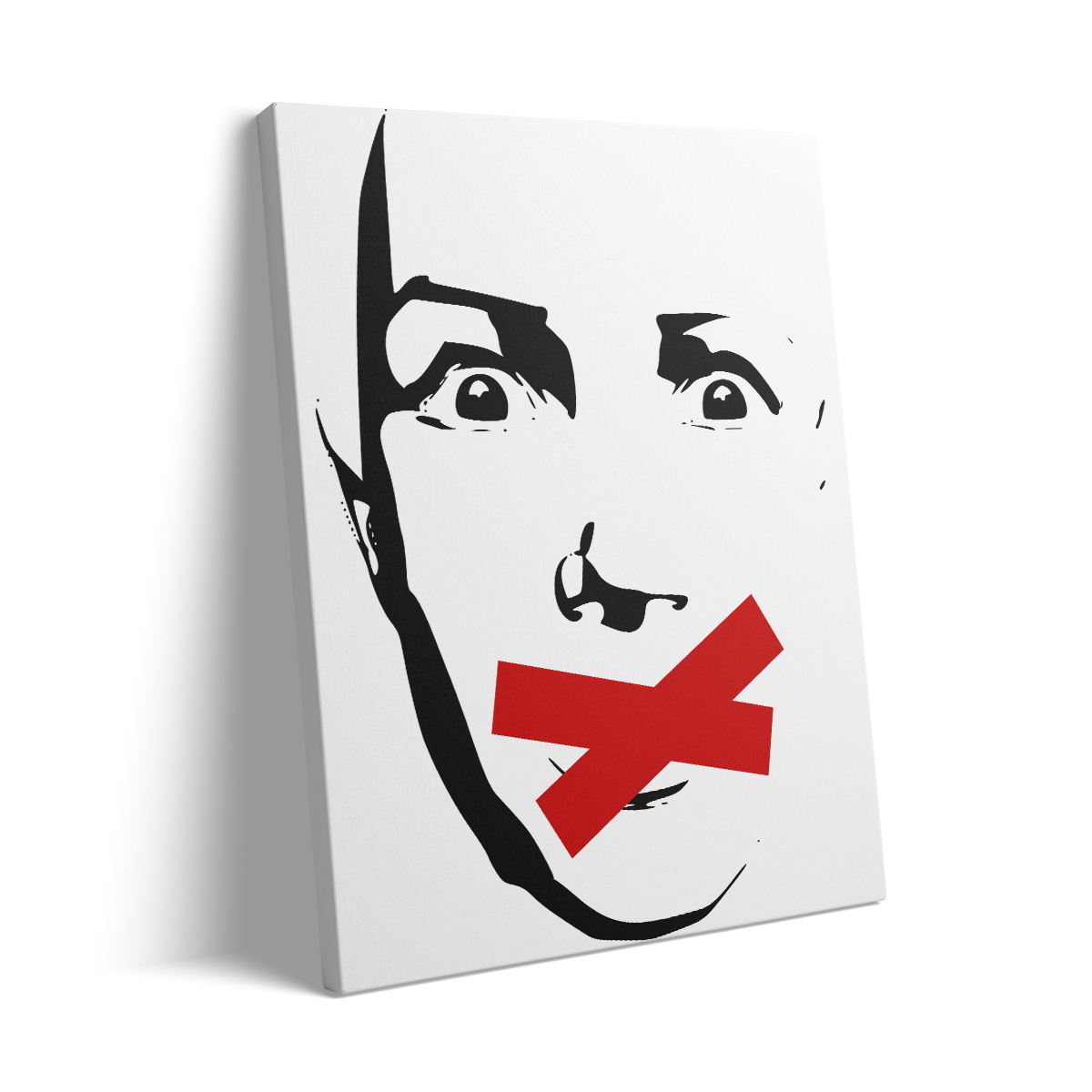 Acest tablou canvas, prezintă un bărbat cu o bandă roșie aplicată peste gură, simbolizând tăcerea impusă și restricțiile comunicării. Designul minimalist, combinat cu intensitatea culorii roșii, evocă o gamă largă de emoții, de la frustrare la protest, invitând privitorul să reflecteze asupra temelor de libertate de exprimare și opresiune. Pânza este realizată cu o atenție deosebită la detalii, iar textura sa adaugă profunzime și caracter lucrării, făcând-o un element de discuție ideal pentru orice spațiu contemporan. Această piesă nu doar că îmbogățește decorul, dar și provoacă gândirea, fiind perfectă pentru colecționarii de artă care apreciază lucrările cu un mesaj puternic și provocator.